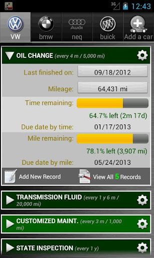For the maintenance reminder function, the application provides comprehensive logging and reminders for almost all regular car services based on both mileage and dates, such as oil change, tire rotation, wheel alignment, air filter change, coolant flush, transmission fluid change, brake pad change, timing belt replacement, annual inspection and spark plug replacement. Even more, you can create your own customized service reminders, log costs, and write notes about your cars, such as part number, state registration, appointment time, mechanic shop phone number etc. With just a glance at your phone, you will have all the service records at hand! Notifications at status bar will automatically show up to remind you when a service is due within a week, or 200 miles, so that you will never miss a needed maintenance.