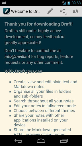 Overview: Draft is a versatile text editor for your Android smartphone and tablet. With Draft you can easily organise, edit and share all your notes.