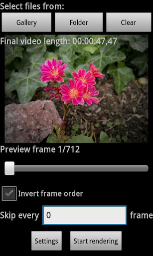 Timelapse videos can be created both from the live camera, and from previously captured pictures (e.g. loaded from gallery, and complete folders).