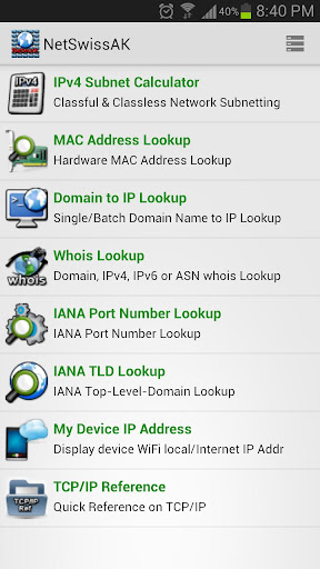 4. Deep Whois lookup at your fingertips (directly from your device). Whois lookup allow you to query list of NICes for details information. Lookup can be base on IP address (IPv4/IPv6), Domain name or AS Number. Result can be store on a local repository for future references.